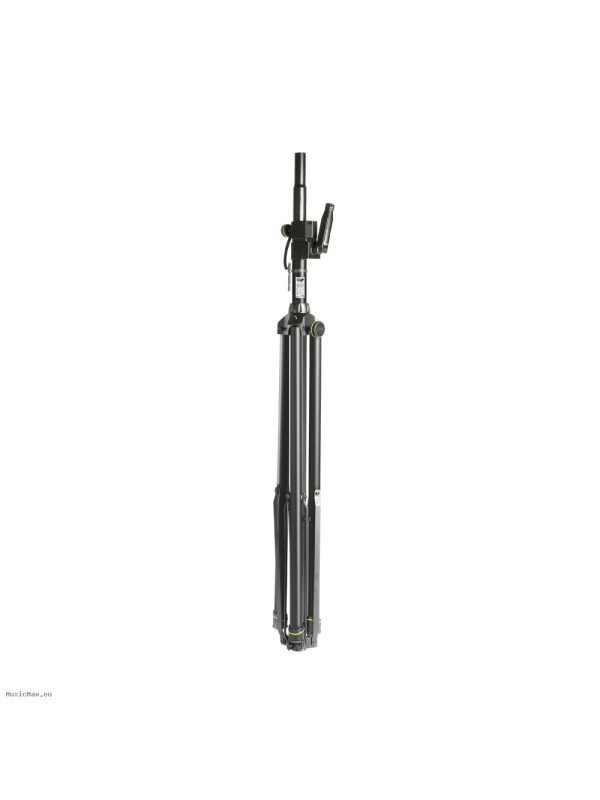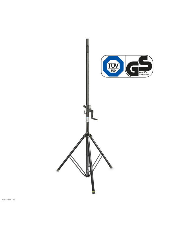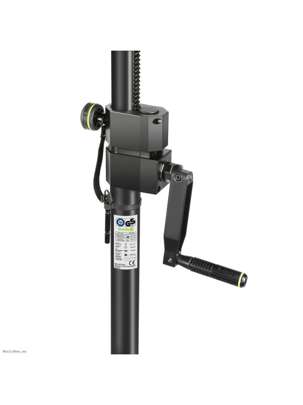 The Gravity GSP 4722 B is a heavy-duty speaker stand with a convenient hand crank and rack and pinion that make it easy to raise your speakers to the desired height. It is made of hard-wearing steel tubing with a folding tripod base and durable cast aluminium leg collar. A large knob set screw and safety pin secure the telescoping pole, which extends from 1.5 m to a maximum height of 2.4 m. The stand is TÜV/GS certified.