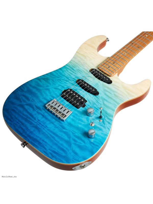 JET JS-1000 QTBL is electric guitar, more modern ST/Super ST model featuring a quilted maple top and the mahogany body of the instrument finished in transparent blue. The combination a handwound Made In Korea Alnico direct-mounted humbucker and two single-coil pickups, gives the guitar a wide variety of sounds suitable for many genres of music.