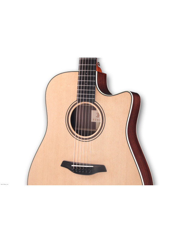 The Furch Green Master’s Choice model is a high-quality all-solid-woods guitar in the Dreadnought shape with cutaway. The guitar features carefully selected tonewoods – the soundboard is made from Sitka spruce, and the back and sides from Indian rosewood. The body is protected by Furch’s proprietary Full-Pore High-Gloss Finish. The sunburst option is available for the soundboard. The combination of tonewoods and finish lends the instrument a stylish appearance underscored by fine walnut and ivory appointments. The guitar produces a rich sound with ringing highs and a fine balance across the entire tonal spectrum.