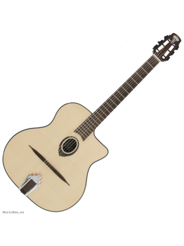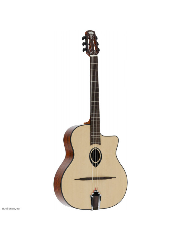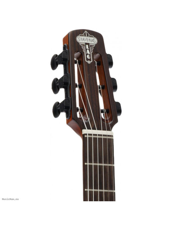 Step into the world of Gypsy Jazz with a refined instrument that blends tradition and performance. Rooted in the legacy of Django Reinhardt and the French manouche style, the SWING LÂG SL200 captures the essence of this iconic sound. Built with a solid spruce top and rosewood back and sides, it delivers a balanced, deep, and articulate tone with excellent projection and clarity. Its traditional petite bouche (oval hole) design, Argentine strings, wooden bridge, and metal tailpiece ensure authentic response and feel. With its elegant high-gloss finish and included semi-rigid gigbag, the SL200 offers a perfect combination of heritage, performance, and value.