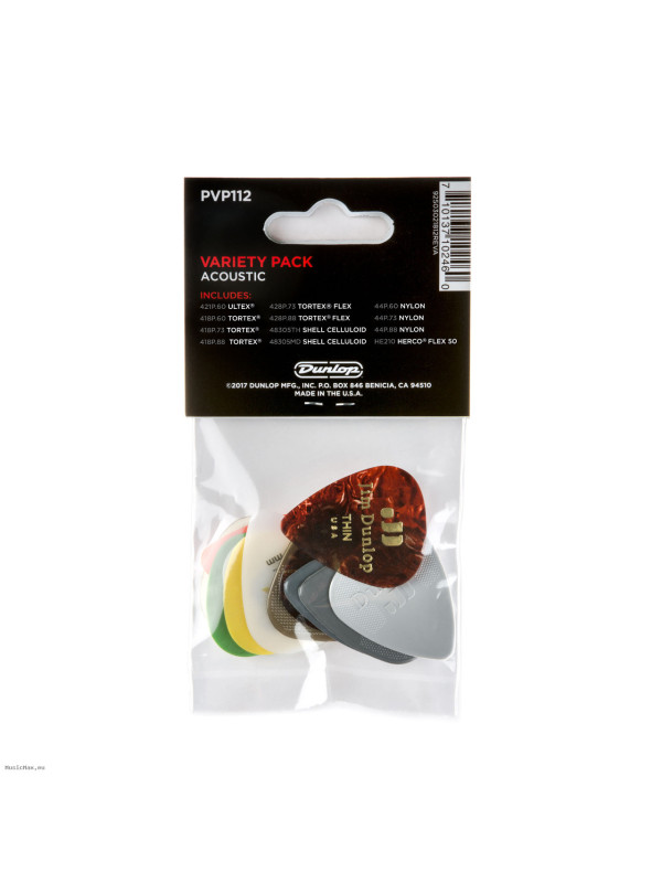 The Dunlop PVP112 Acoustic Pick Pack offers a variety of shapes and gauges for versatile acoustic playing. It includes 12 picks featuring Tortex, Nylon, Ultex, and Delrin models in assorted thicknesses – perfect for exploring different styles and techniques.