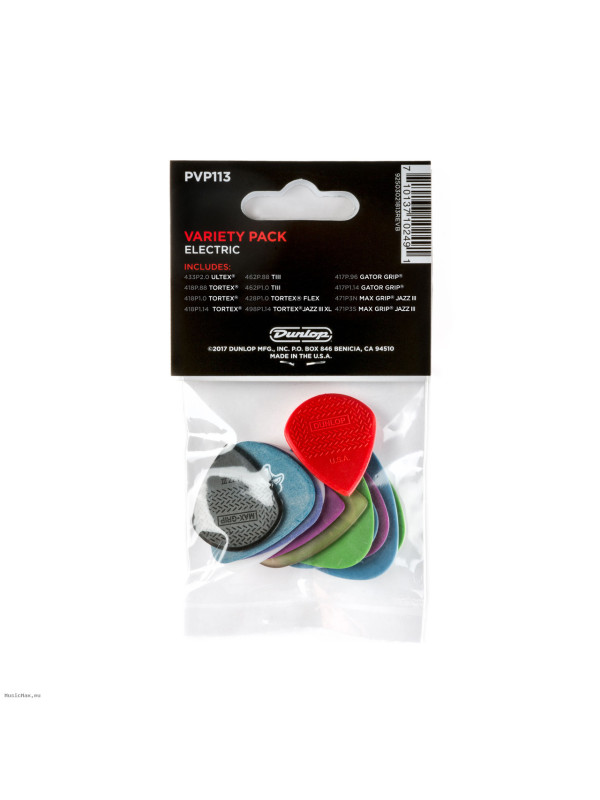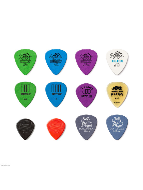 Electric Pick Variety Pack Contains: Ultex Sharp Pick 2.0mm, Tortex Standard Pick 1.14mm, Tortex Standard Pick 1.0mm, Tortex Standard Pick 1.14mm, Tortex TIII Pick .88mm, Tortex TIII Pick 1.0mm, Tortex Flex Pick 1.0mm, Tortex Jazz III XL 1.14mm, Gator Grip Pick .96mm, Gator Grip Pick 1.14mm, Max Grip Jazz III Pick, Max Grip Jazz III Stiffo Pick.