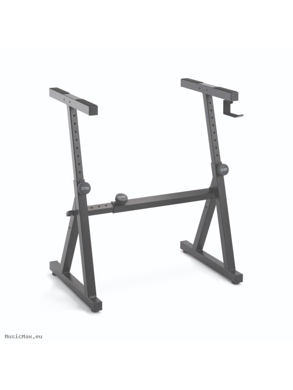 The heavy duty yet portable KS1355 Single Tier Z Keyboard Stand offers strong and durable support for keyboards of all shapes and sizes. This portable, ergonomic keyboard stand is a must have for keyboardists looking for a lightweight, but stable keyboard stand. Boasting an impressive 400lb weight capacity and a nonslip rubber grip on the top of the arms, you can rest assured that your keyboard or synthesizer is safe and sound on top of the KS1355. The included headphone hangers allows users to keep their headphones and in-ear monitors close and ready to use. The KS1355 comes in a sleek black finish, making it a perfect fit to blend in with any of your current rig, while remaining sleek and functional. The height and width of the KS1355 Single Tier Z Keyboard stand is adjustable. Using the pull & tighten knobs on the frames, you can adjust the height from 20.5” to 33.5” and adjust the width from 21” to 34”. The KS1355 is not only adjustable, but it is also portable. The center bar detaches easily from both sides of the stand with no tools required. Simply use the cat’s eye knobs to connect and disconnect the center bar.