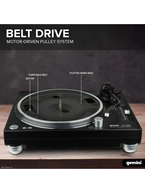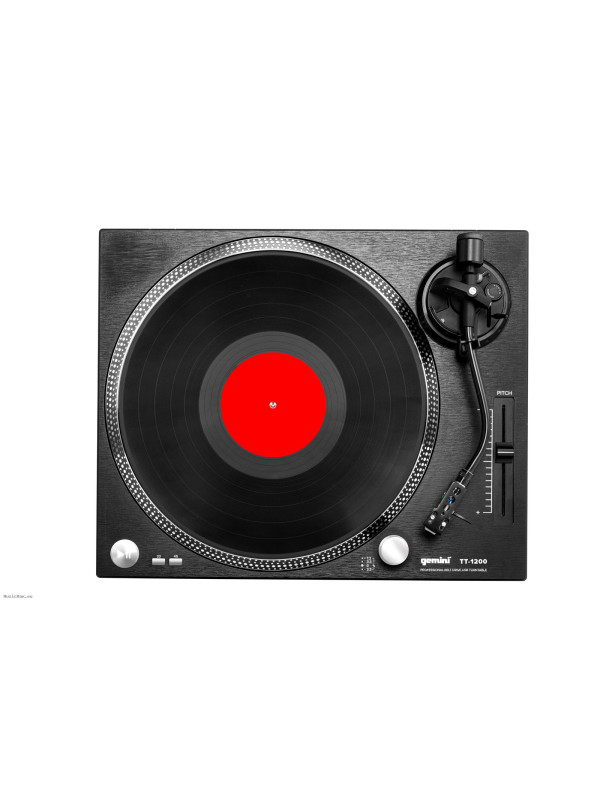 Gemini's TT-1200 belt-driven turntable features a redesigned chassis with reinforced cabinet construction. The TT-1200 uses a precision-machined, die-cast aluminum platter for optimal smoothness. Optimized damping characteristics and shock-absorbing feet help eliminate unwanted noise and vibration, even in noisy club environments. It is ideal for DJs, audiophiles and casual listeners alike.