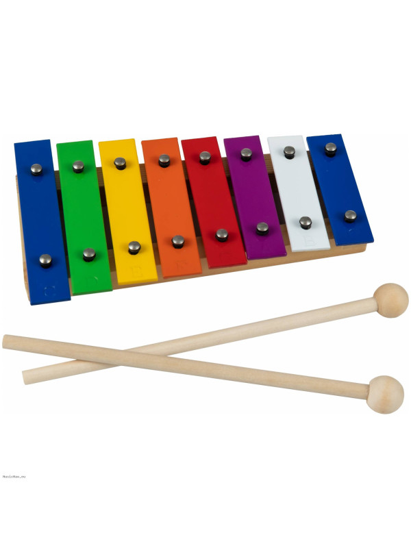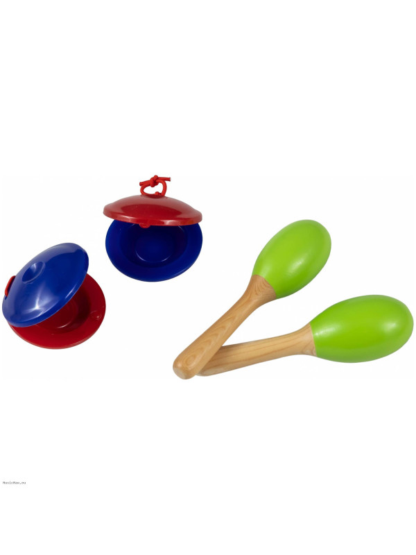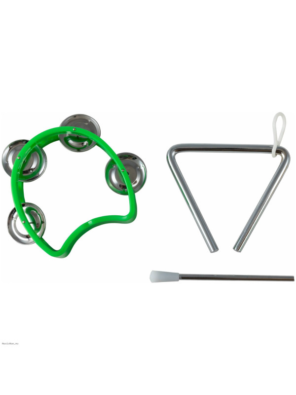 The TERRIS PNS-10BP percussion set consists of 10 colorfully designed pieces: a multicolored glockenspiel with a stick, a tambourine, a pair of maracas, a pair of plastic castanets, two pairs of egg-shaped shakers, a metal triangle with a stick, and three jingle sticks.